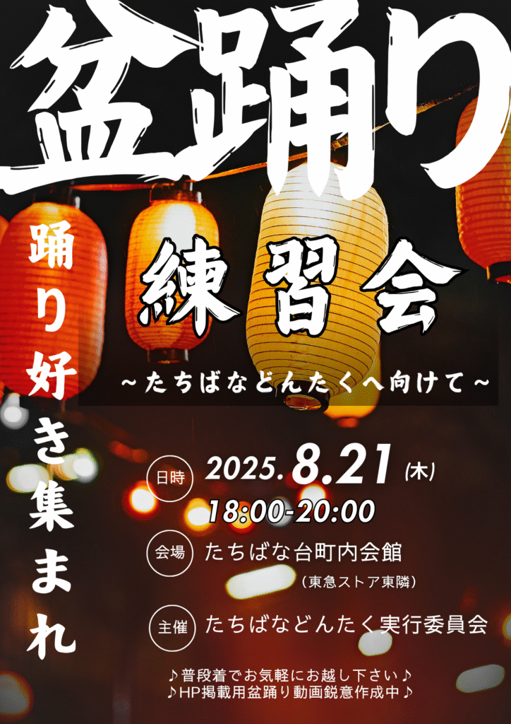 8/21 盆踊り練習会のお知らせ どんたく 2025.07.132025.08.22 日時:2025.8.21(木)18:00-20:00会場:たちばな台町内会館(東急ストア隣)主催:たちばなどんたく実行委員会 ♪普段着でお気軽にお越し下さい♪♪HP掲載用盆踊り動画鋭意作成中 ♪